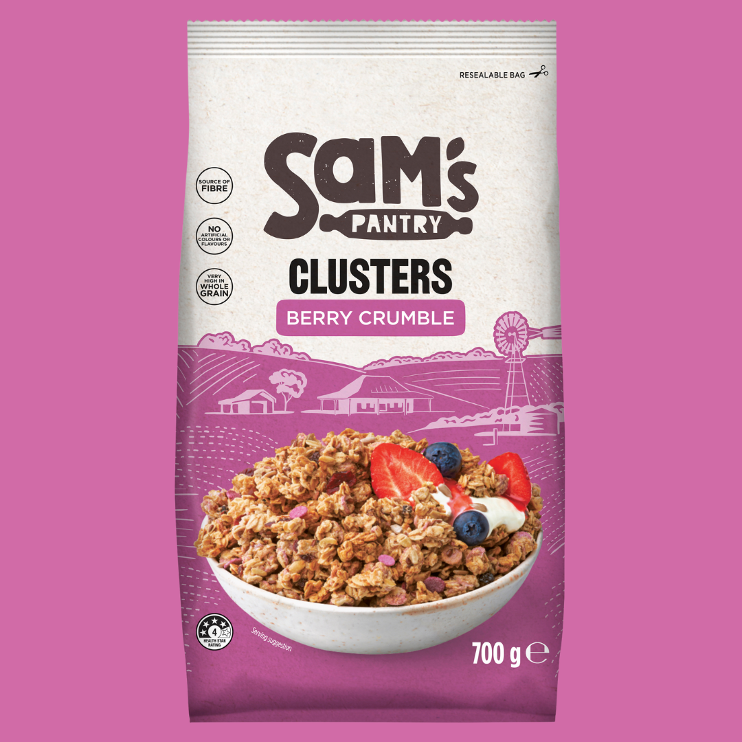 Clusters of crispy Aussie oats, with sunflower seeds and infused with delicious berries