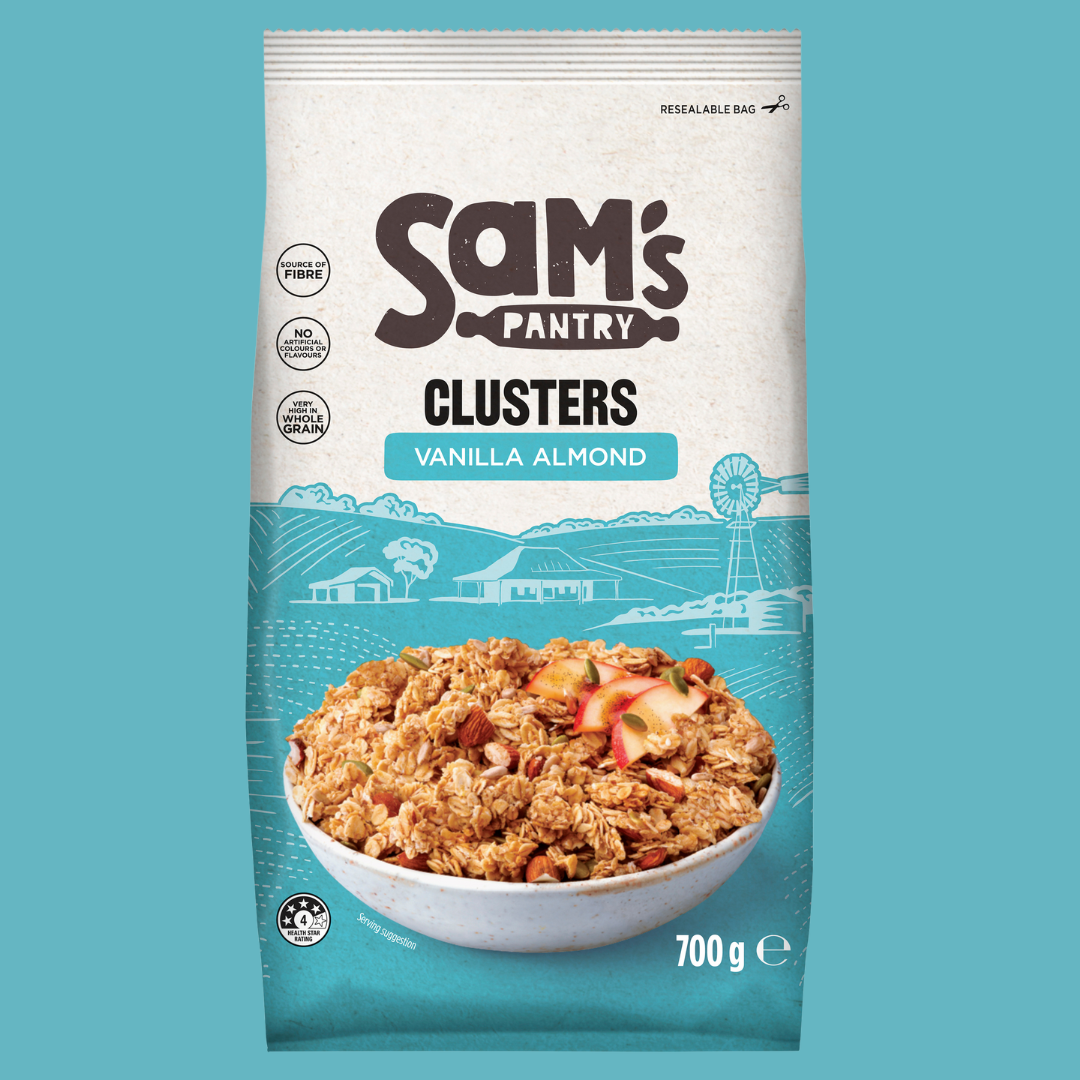 Clusters of crispy Aussie oats and almonds, with sunflower seeds and pepitas baked with vanilla flavoured syrup.